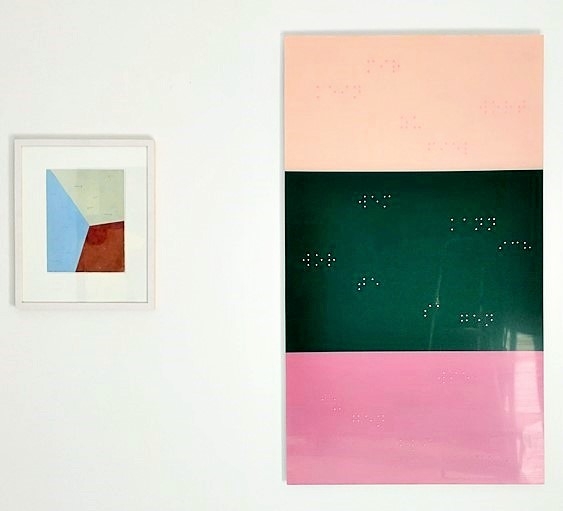 Wiesbaden: VIP-Lounge der Nassauischen Sparkasse, sehe sagen (Wandmalerei mit Brailletext und Hinter-glasmalerei-Objekten), 2001 [s. Katalog erkenntnisse …?]